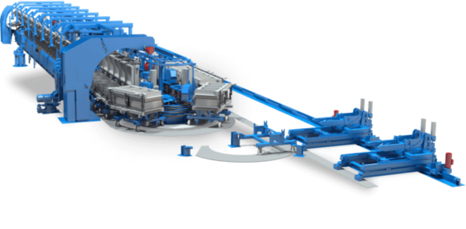 Für eine effiziente Fertigung höchster Stückzahlen bietet KraussMaffei modulare Ovalanlagen an. Die Formenträger sind als Kassetten ausgeführt und auf Laufwagen montiert, die mit einer Kette befördert werden. Eine zentrale Station mit hydraulisch vorgespannter Umlenkstation treibt die Kette an.
