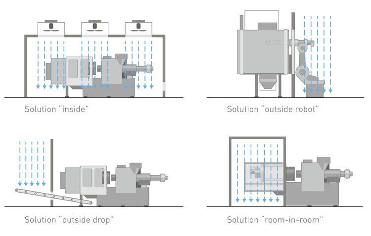 Komplette Produktionszellen bestehend aus Spritzgießmaschine und Automation für die höchsten Anforderungen der Medizin und Pharmaindustrie.