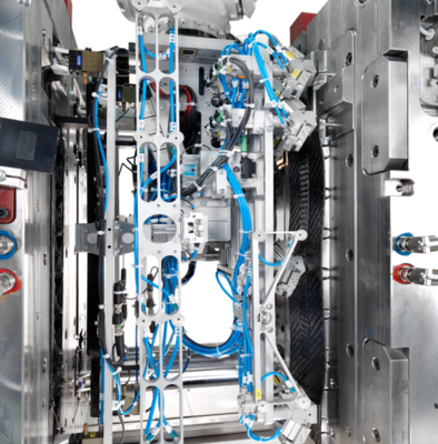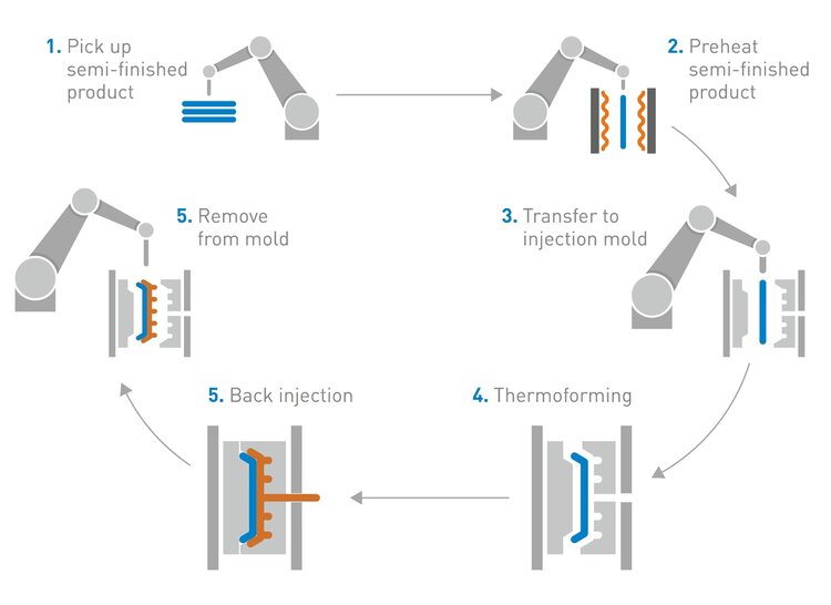 Das FiberForm Verfahren ist ein Leichtbauverfahren und setzt Organobleche oder UD-Tapes als Halbzeuge im Spritzgießprozess ein. Diese Einleger bestehen aus einer thermoplastischen Matrix, meist getränkt mit Glas- oder Kohlefasergewebe, und werden über eine Automationslösung zugeführt, in einem Ofen vorgeheizt und dann im Werkzeug durch die Schließbewegung umgeformt und anschließend mit Kunststoff hinterspritzt. Auf diese Weise werden hoch feste, gezielt verstärkte Formteile hergestellt, die im Vergleich zu beispielsweise Metallkomponenten einen deutlichen Gewichtsvorteil bieten.