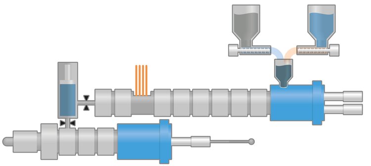 - Schnittstelle zwischen kontinuierlicher Extrusion und diskontinuierlichem Spritzgießverfahren