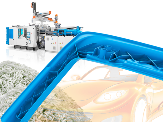 In the chopped fiber processing (CFP), chopped fibers (e.g. glass fibers) are added to the pellets at the infeed of a plasticizing unit via an additional metering system and processed gently using a new special KraussMaffei screw geometry. This processing concept enables fiber-reinforced components to be produced cost-effectively with very good properties.