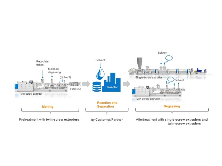 Because we are pioneers. Each major process category in the field of recycling that involves extruders has already been implemented using our extrusion technology. Solvent-based processes, solvolysis, and even pyrolysis are not new to us: our extruders often play an integral role in these applications.
